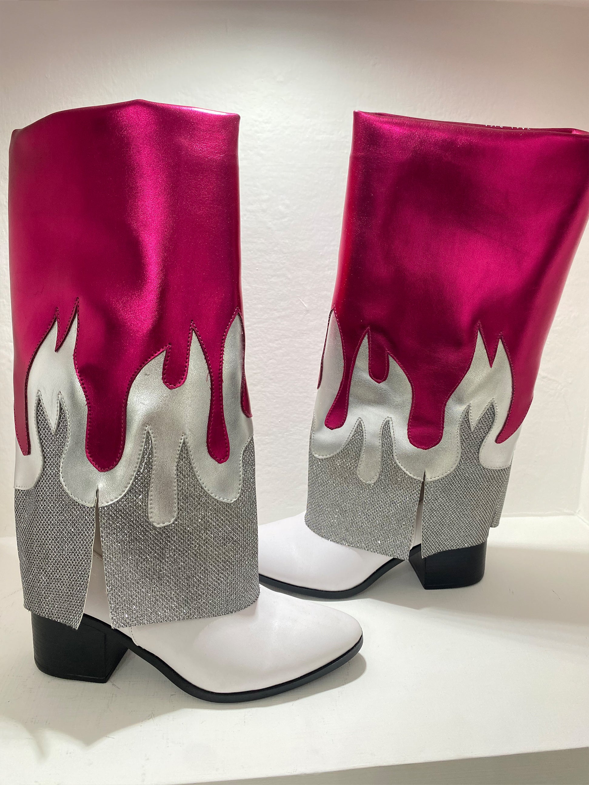 Botas tipo cowboy color blanco con detalles en color bugambilia y plata.