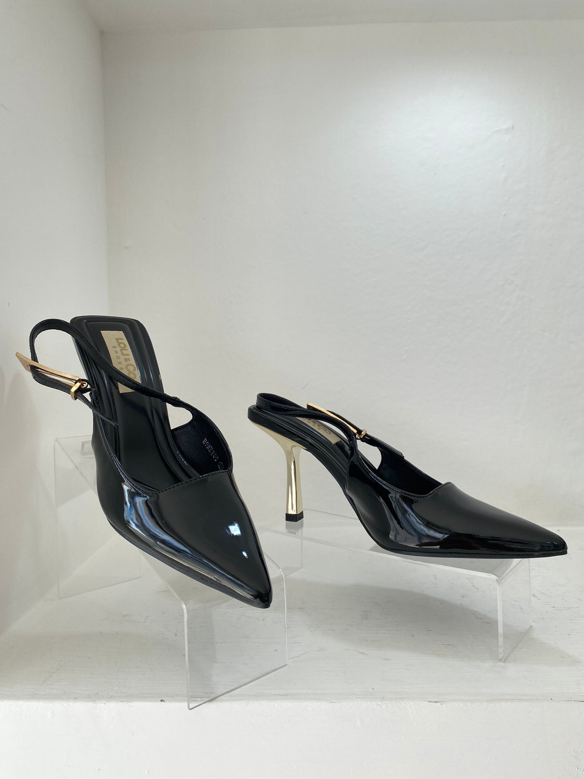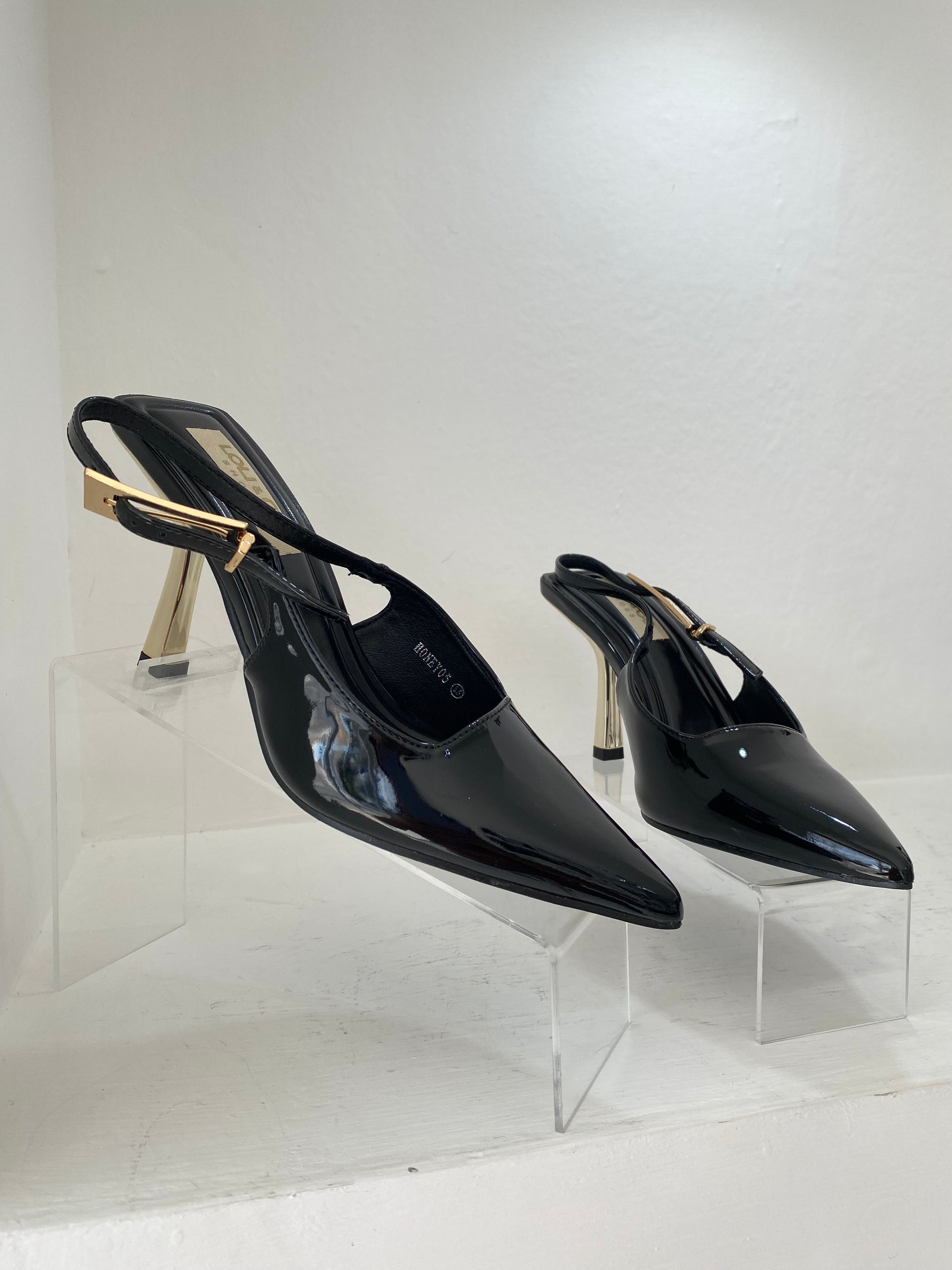 Tacones color negro con hebilla dorada.